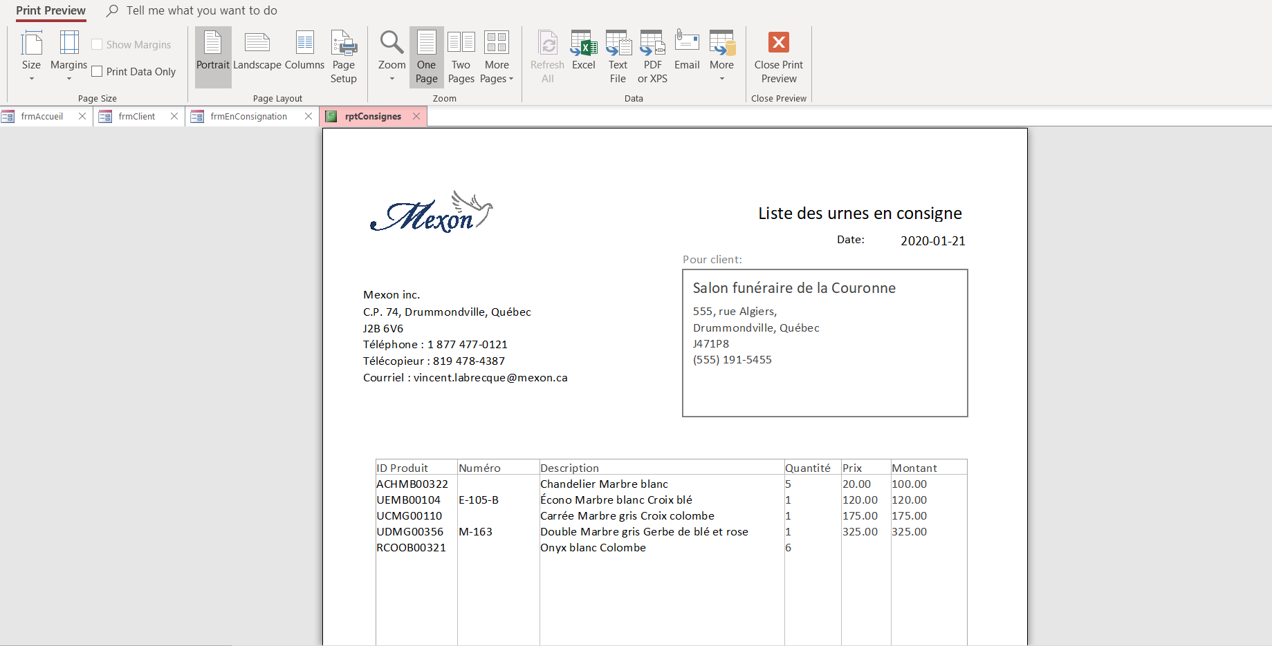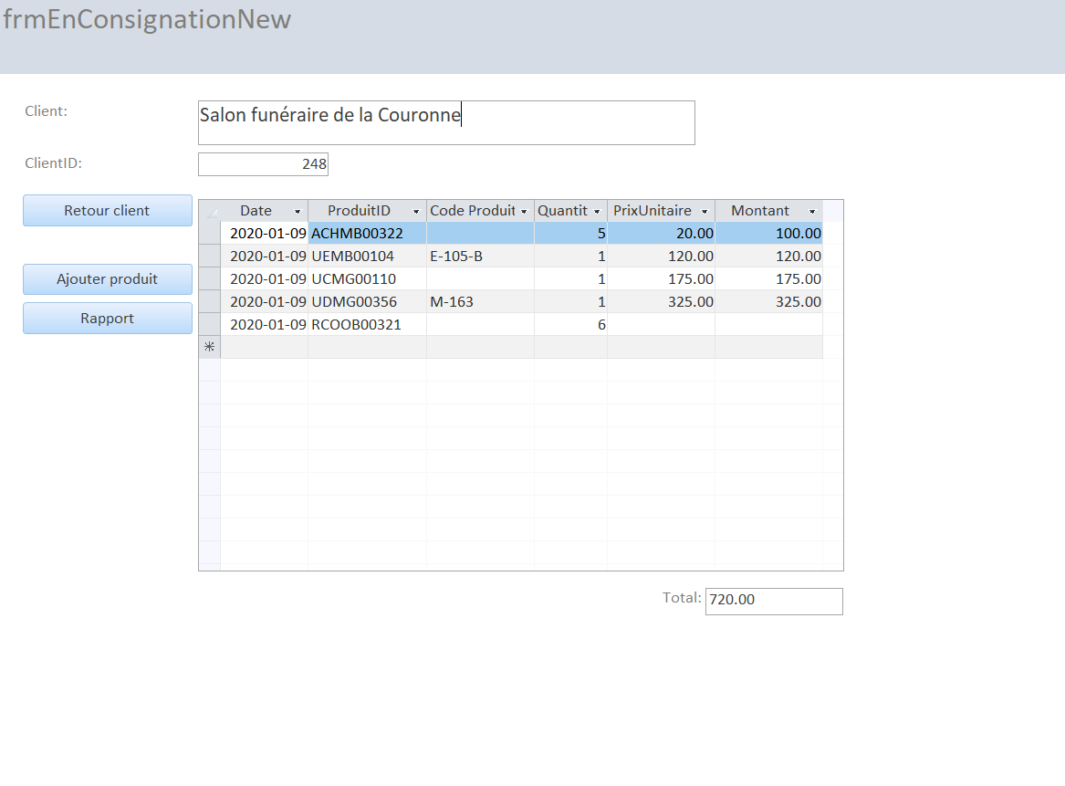 Pour ma compagnie de distribution de produits funéraires, j'ai mis mes aptitudes en programmation à l'épreuve en 2017 et j'ai bâti un logiciel de gestion des relations clients qui m'a beaucoup aidé à gérer ma compagnie. Voici un aperçu sommaire.