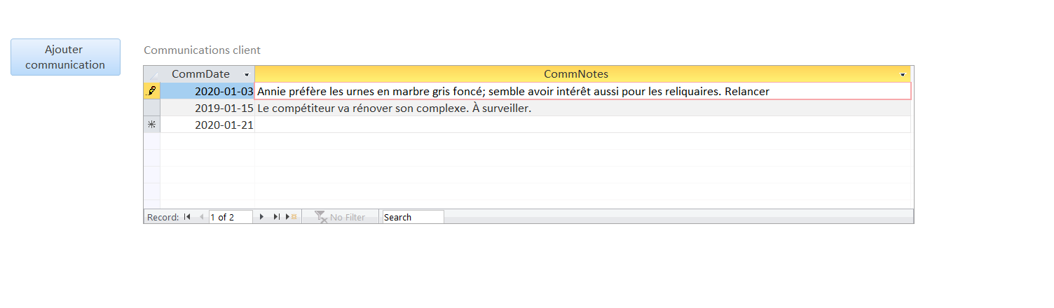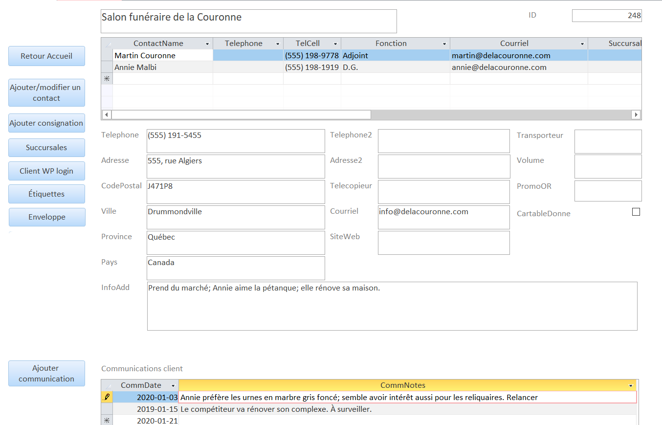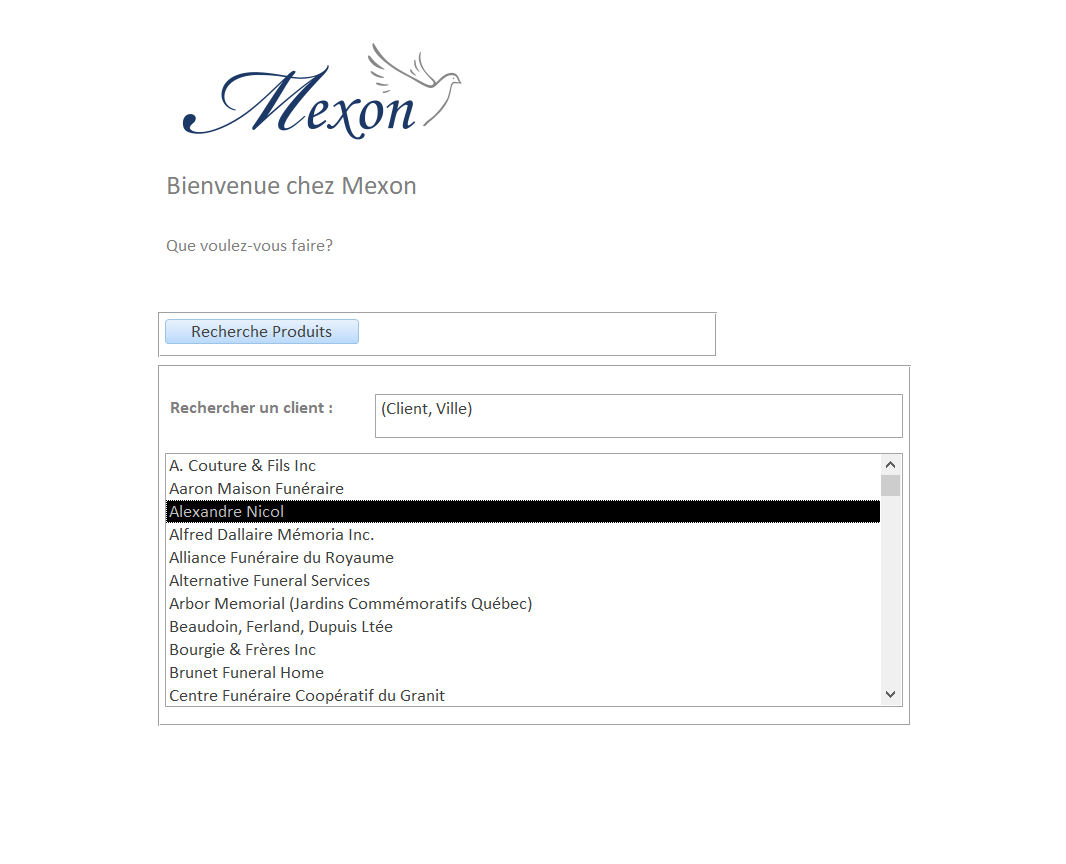Pour ma compagnie de distribution de produits funéraires, j'ai mis mes aptitudes en programmation à l'épreuve en 2017 et j'ai bâti un logiciel de gestion des relations clients qui m'a beaucoup aidé à gérer ma compagnie. Voici un aperçu sommaire.